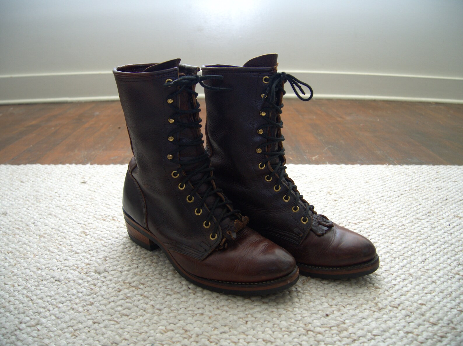 This classic tall boot also includes a spanish top, a round toe, and a rubber outsole.