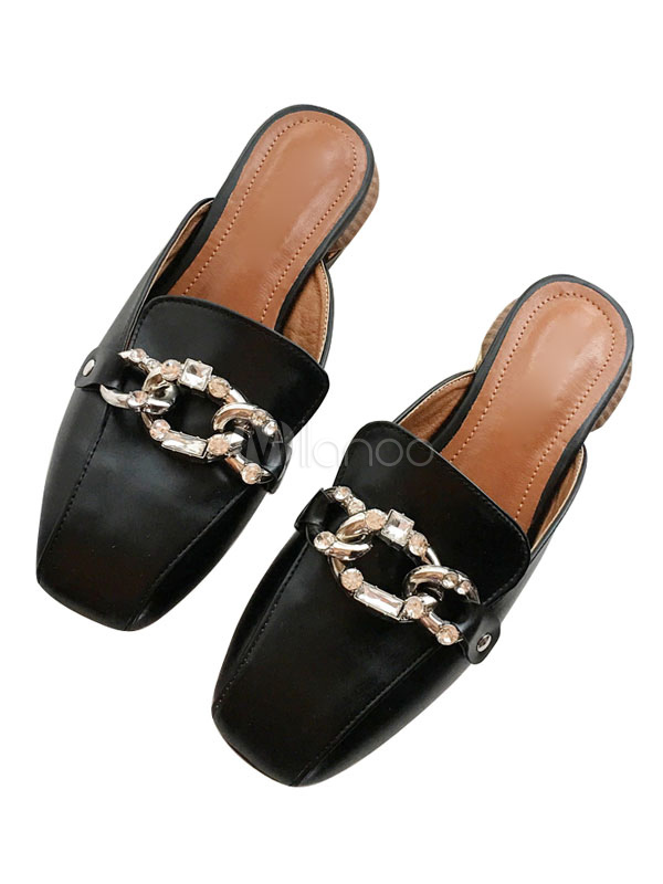 Women Mule Shoes White Square Toe Rhinestones Backless …